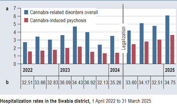 En conclusion, cette première analyse allemande suggère une augmentation marquée des hospitalisations pour psychose induite par le cannabis dans l’année ayant suivi la légalisation, sans hausse parallèle des autres troubles psychotiques majeurs. Si ces résultats ne permettent pas d’établir un lien de causalité direct, ils alimentent le débat sur les effets psychiatriques de la légalisation et soulignent l’importance d’un suivi sanitaire rigoureux à moyen et long terme.