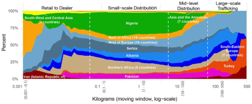 Certaines nationalités ont été identifiées dans le trafic d’héroïne à grande échelle : les afghans près de l’Afghanistan, les iraniens et les pakistanais sur une plus grande étendue de territoire. Les azerbaïdjanais sont actifs dans le trafic à grande échelle mais aussi à petite et moyenne échelle, mais surtout dans leur pays voire dans les pays voisins. Les albanais et serbes, groupes émergents en Europe dans le trafic d’héroïne, sont principalement impliqués dans la revente à moyenne et petite échelle.